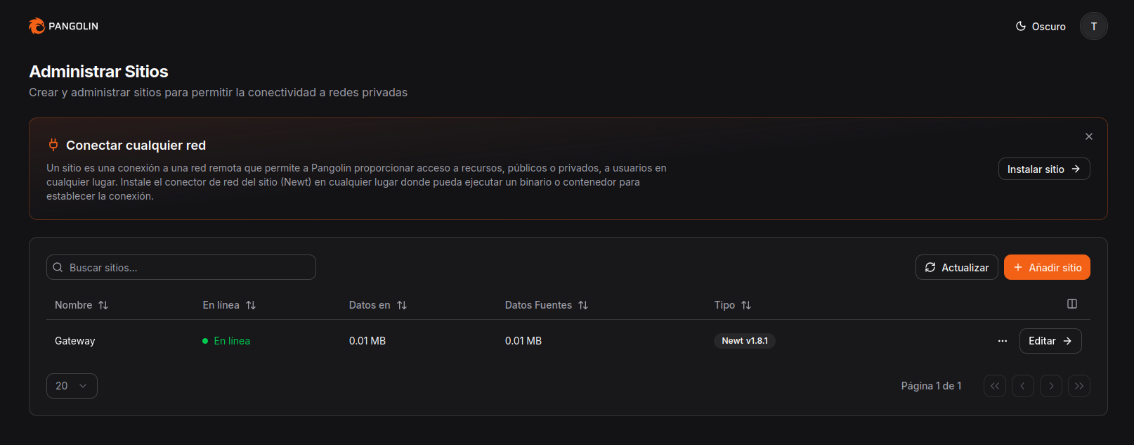 systemctl enable pangolin.serviceAhora si volvemos al apartado de sitios de Pangolin, veremos que aparece el que hemos creado y aparece en linea: