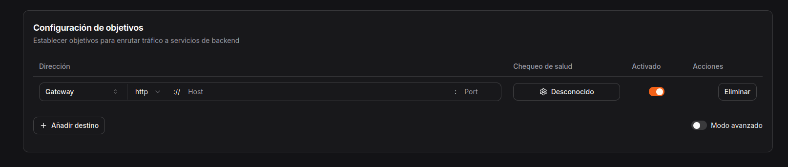Primero tenemos que seleccionar nuestro sitio, en este caso el que hemos creado anteriormente y que yo he llamado Gateway. Luego tenemos que rellenar la URL, en mi caso Immich se encuentra en http://IP_LOCAL:2283 tenemos que rellenar eso. Luego podemos también activar el Chequeo de salud, donde podemos hacer un GET a la misma URL.