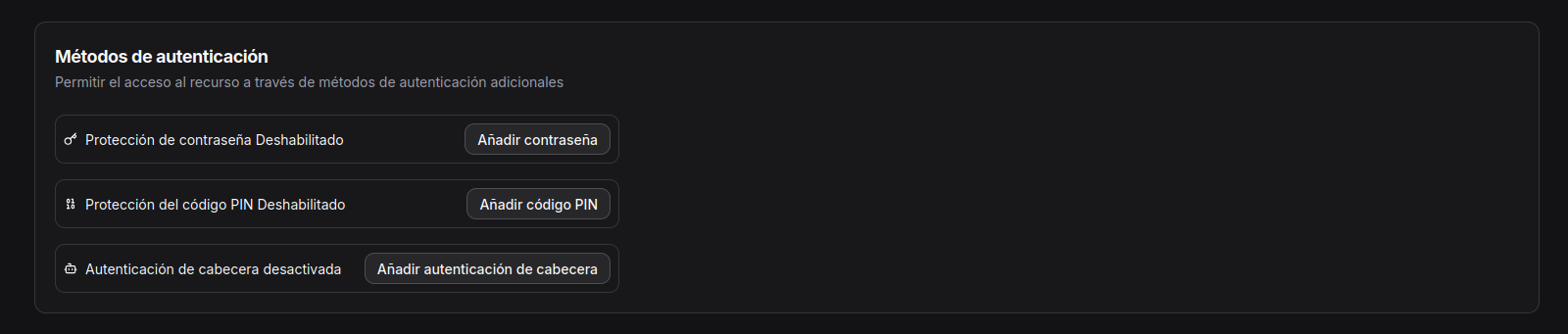 - Protección de contraseña: Añade una capa de autenticación clásica mediante usuario y contraseña antes de acceder al recurso. Es el método más seguro y adecuado para servicios sensibles o paneles de administración, ya que controla de forma explícita quién puede acceder al servicio.