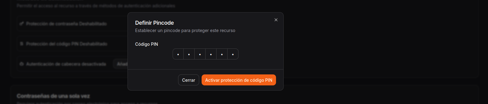 - Protección del código PIN: Protege el recurso con un código numérico compartido. Es una opción rápida y sencilla, pensada para accesos personales o de uso ocasional, donde se prioriza la comodidad frente a un control detallado de usuarios.