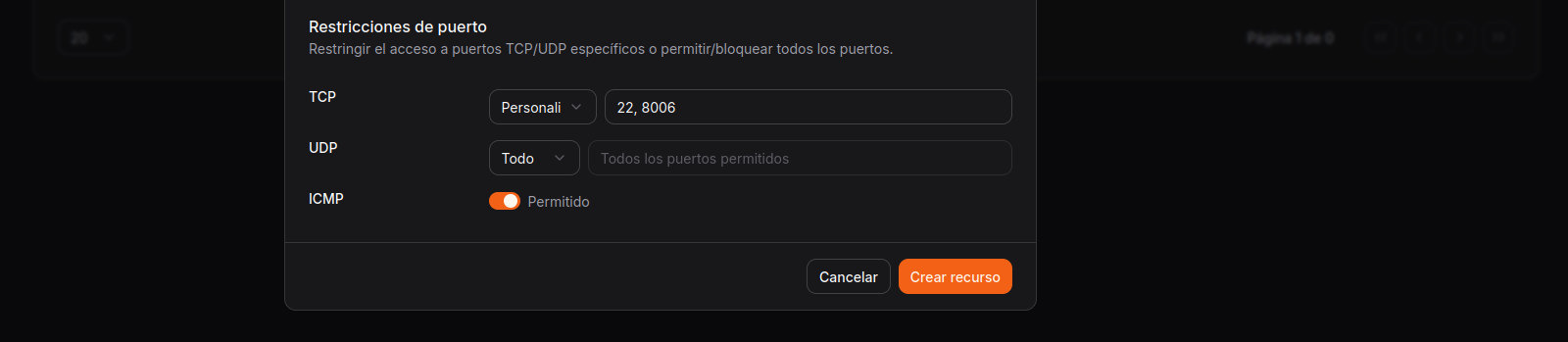 proxmox.internal. - Restricciones de puerto: En la configuración de puertos, podemos dejarlo por defecto, aún que si queremos que únicamente haya acceso a los puertos 22 (SSH) y 8006 (Interfaz web de Proxmox) se puede configurar.