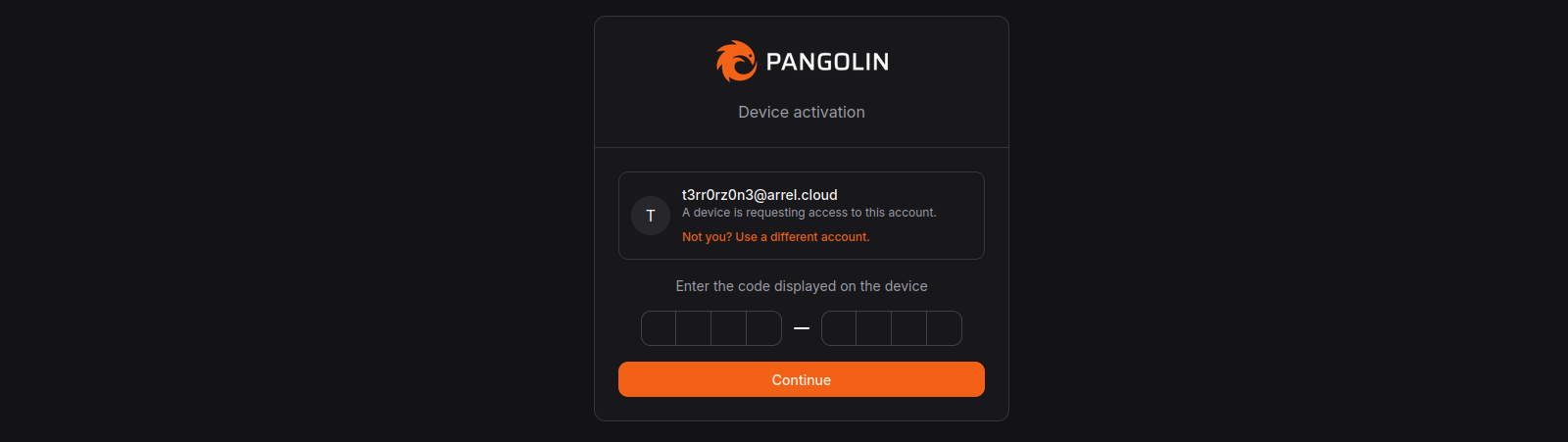 Press Enter to open https://pangolin.tudominio.com/auth/login/device in your browser...Nos pedirá iniciar sesión a Pangolin y luego poner el código de un solo uso que se muestra en el dispositivo: