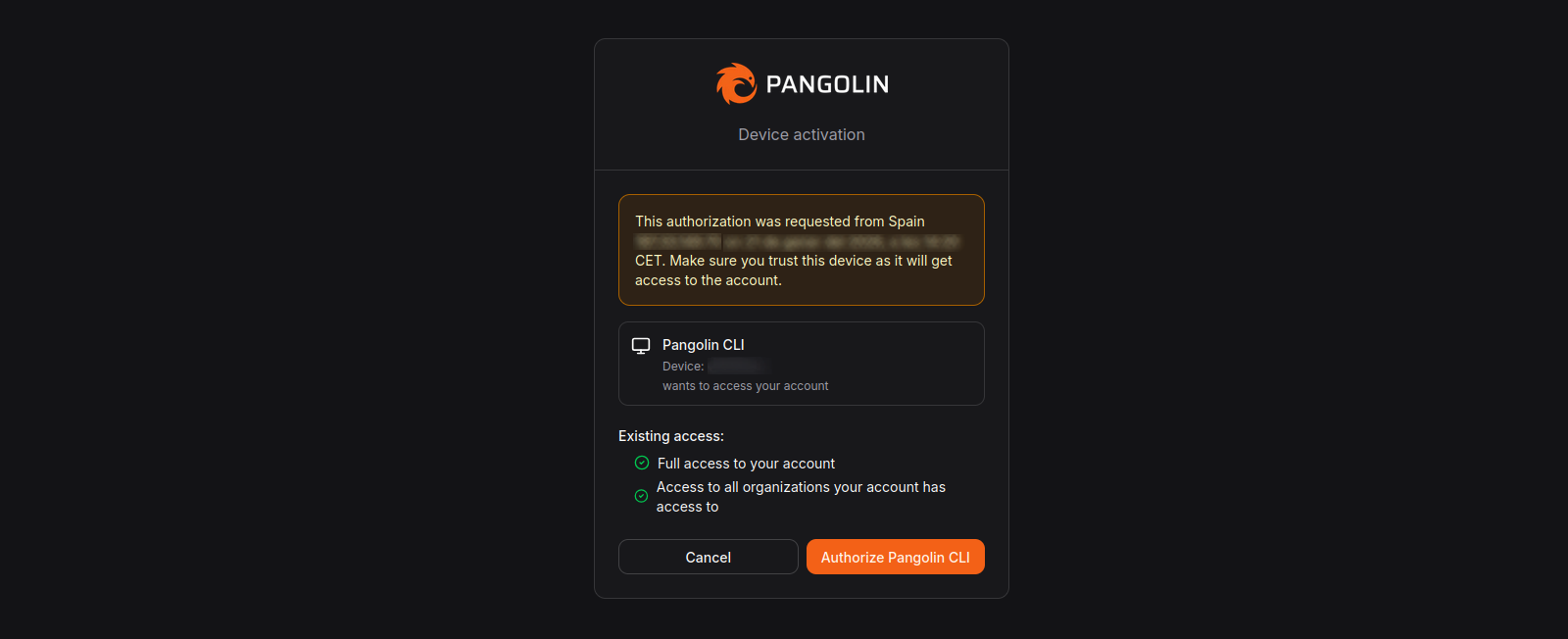 Tras añadir el código, nos indicará una serie de información y autorizaremos el acceso a Pangolin: