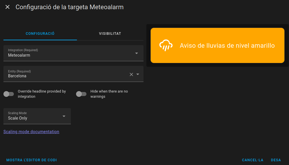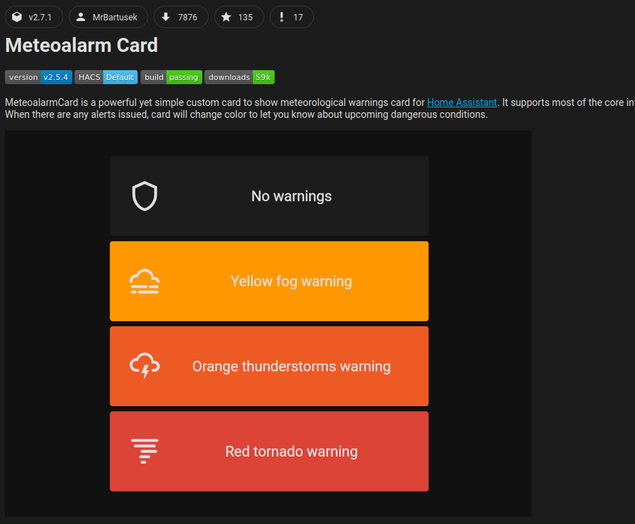 Tendremos que instalar el repositorio y luego añadir una tarjeta nueva y seleccionar la tarjeta personalizada Meteoalarm Card.