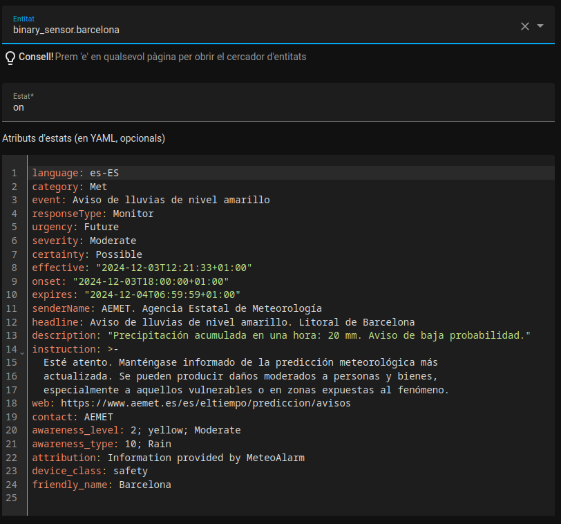 Como hemos visto antes, en mi caso el binary_sensor.barcelona muestra mucha información sobre el aviso de la AEMET. Cuando no hay avisos, este sensor se muestra como OFF, mientras que cuando hay avisos se muestra como ON.