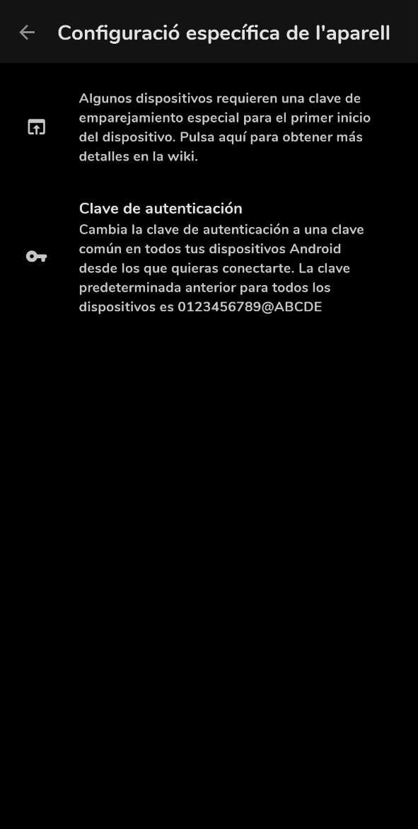 Cuando aparezca nuestro dispositivo, mantenemos tocado y se nos abrirá la Configuración especifica del dispositivo. En las opciones que nos aparece una de ellas es Clave de Autentificación. Tocamos y añadimos la Key que hemos obtenido antes.