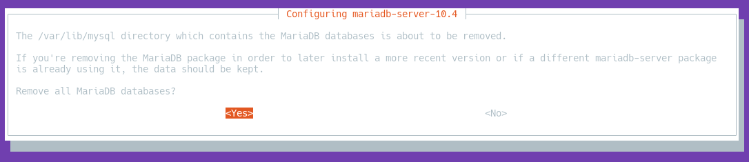 dpkg -l | grep mariadb.Durante el proceso, nos preguntará si queremos eliminar todas las bases de datos: