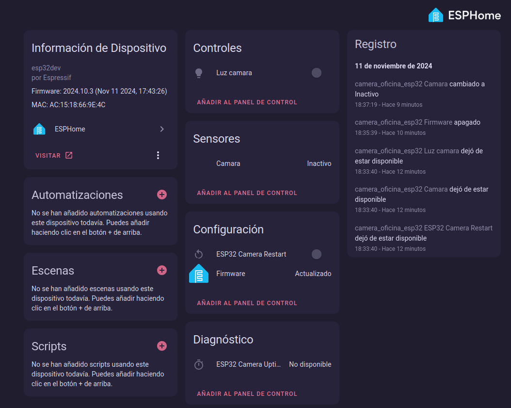 name: "ESP32 Camera Uptime Sensor"Guardamos e instalamos la nueva configuración. Tras la instalación tendremos los siguientes sensores disponibles: