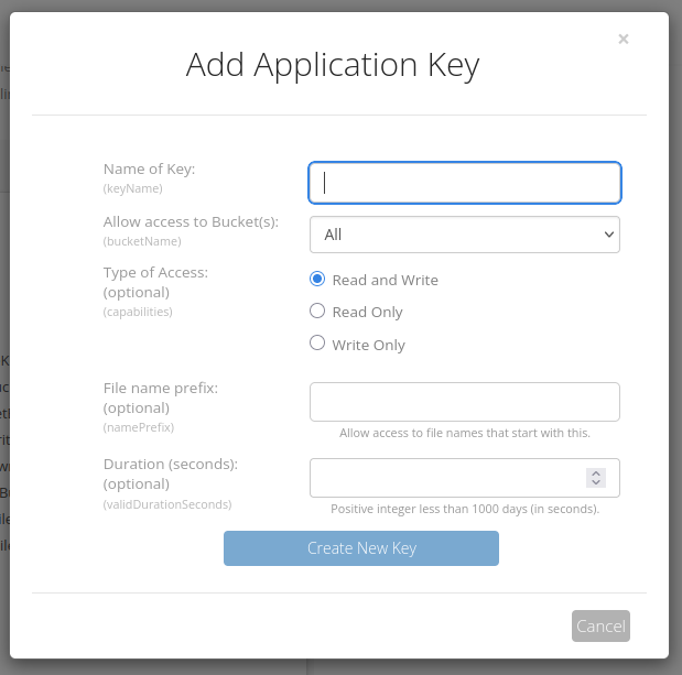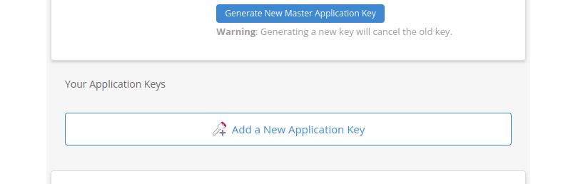 A continuación, dirígete a B2 Cloud Storage - Application Keys y crea una nueva clave de acceso haciendo clic en Add a New Application Key. Esta clave será la que utilizaremos más adelante para que Home Assistant pueda autenticarse y subir las copias de seguridad al bucket de forma segura.