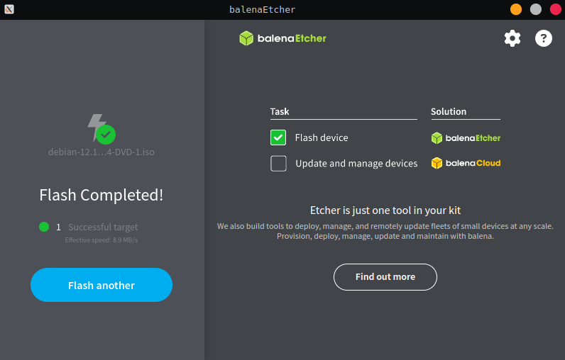 Una vez completada la verificación, BalenaEtcher mostrará un mensaje indicando que el proceso ha finalizado correctamente. A partir de este momento, tu USB está listo para ser utilizado. Puedes usarlo para instalar una distribución GNU/Linux en un equipo… ¡o en tantos como necesites!