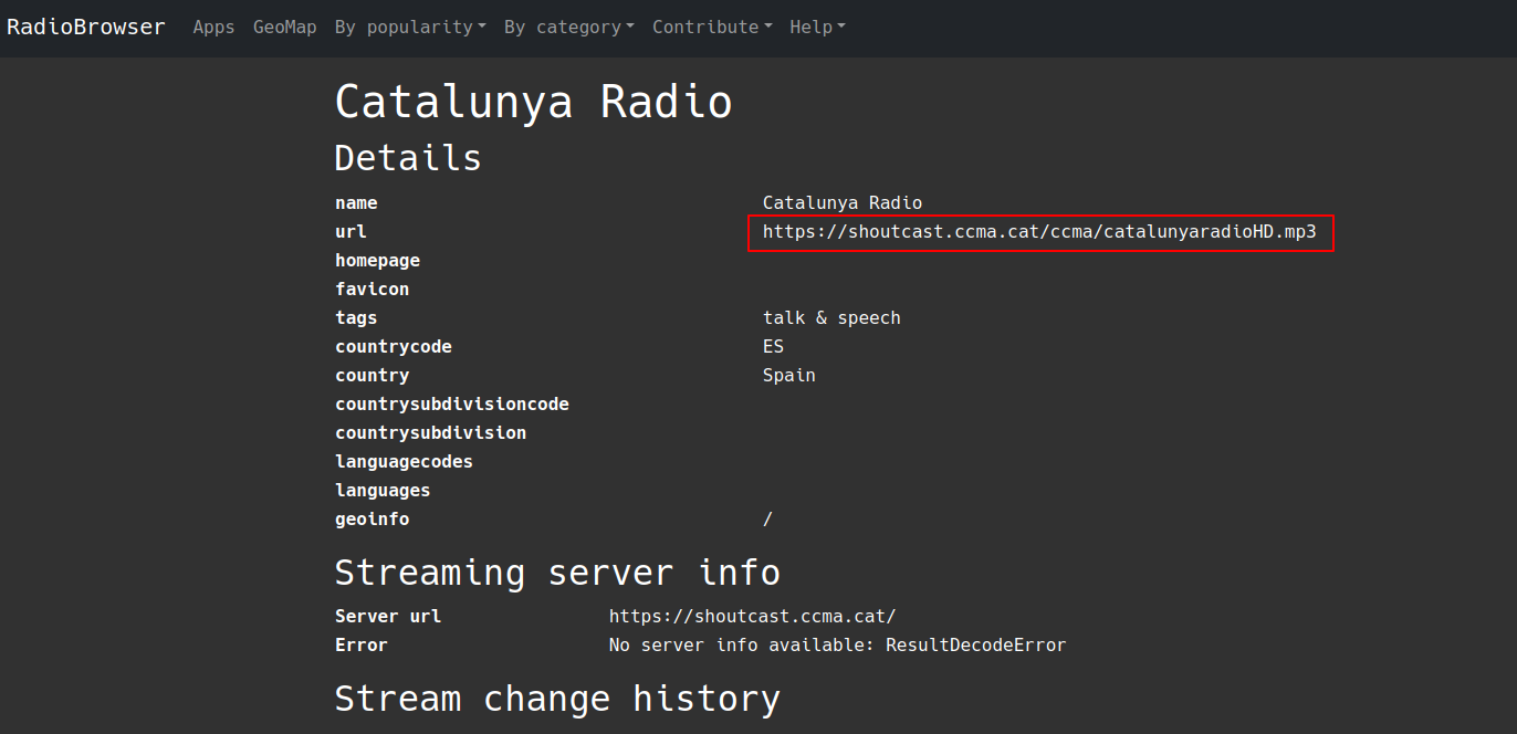 Si queréis configurar una radio en Navidrome, mi recomendación es que primero necesitáis el enlace con el MP3 del stream para escucharlo. Esto lo podéis conseguir directamente en la web de radio-browser.info.