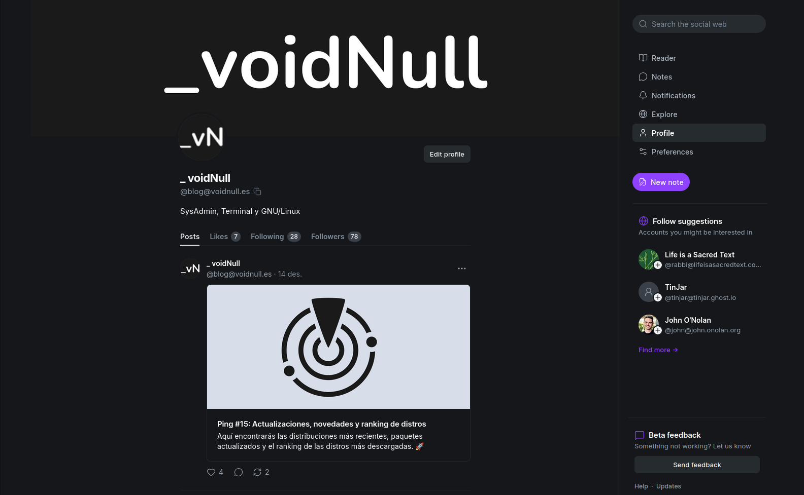Desde agosto de 2025, voidnull forma parte activa del Fediverso. Esto significa que el blog ya no es solo un sitio web tradicional, sino que está conectado directamente a la red social descentralizada basada en ActivityPub. A partir de ese momento, los artículos publicados en voidnull pueden seguirse, compartirse y comentarse desde plataformas del Fediverso como Mastodon, sin depender de redes sociales centralizadas.