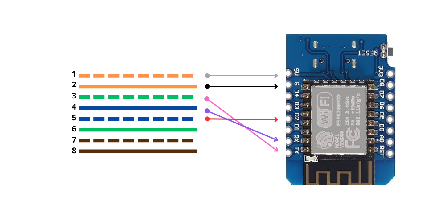 Básicamente tenemos que hacer las siguientes conexiones y soldar los siguientes cables de red con cables dupon:
