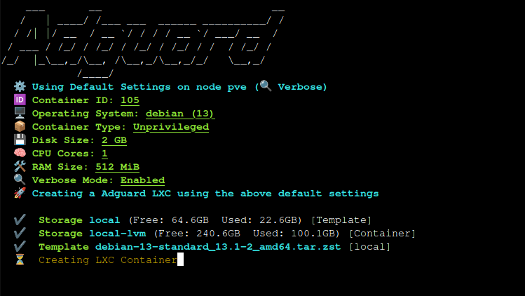 bash -c "$(curl -fsSL https://raw.githubusercontent.com/community-scripts/ProxmoxVE/main/ct/adguard.sh)"Este script lanzará el asistente de instalación: