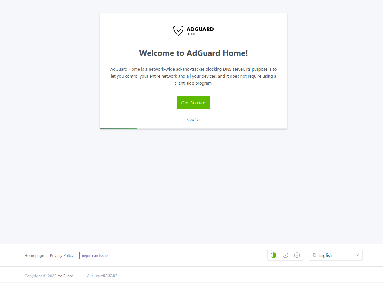 Se iniciará un asistente para configurar AdGuard Home. Simplemente haz clic en Get Started para continuar con el proceso de configuración.
