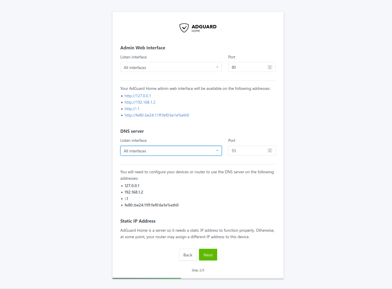 En el siguiente paso configuraremos la interfaz de administración. Podemos indicar la IP en la que queremos que escuche y el puerto que usará para acceder al panel.