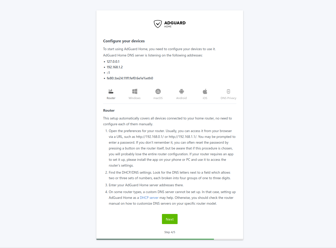En el cuarto paso, el asistente te mostrará cómo configurar tus dispositivos para que utilicen AdGuard Home como servidor DNS. Más adelante veremos cómo hacerlo temporalmente en GNU/Linux y también de forma permanente desde el router.