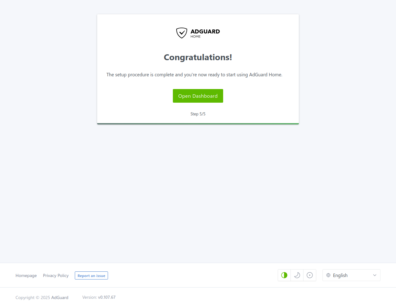 En el último paso, la configuración habrá finalizado. Ya podrás abrir el panel de control e iniciar sesión con las credenciales que has creado.