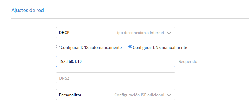 Allí, en el campo DNS1, introducimos la IP de nuestro servidor AdGuard Home.