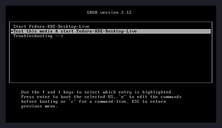 Cuando el sistema arranque desde el USB, te aparecerá un menú con varias opciones. La que debes elegir es "Start Fedora-KDE-Desktop-Live".