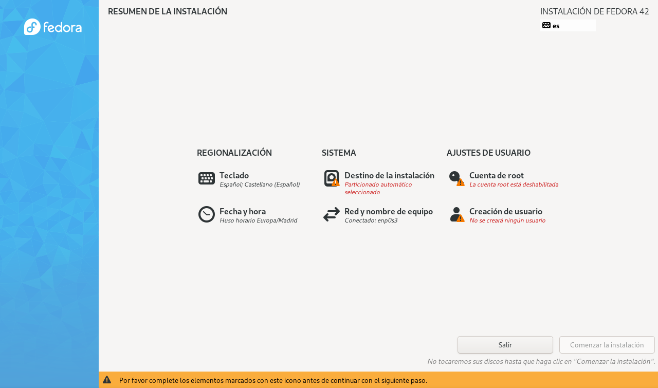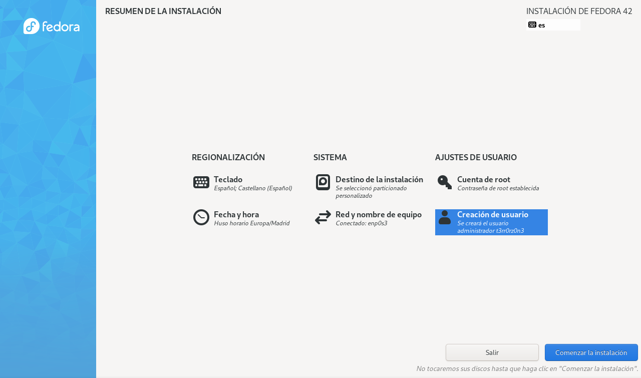 El instalador de Fedora te mostrará un resumen de la instalación, aquí deberemos de seleccionar apartado por apartado y configurando todo lo que necesitemos