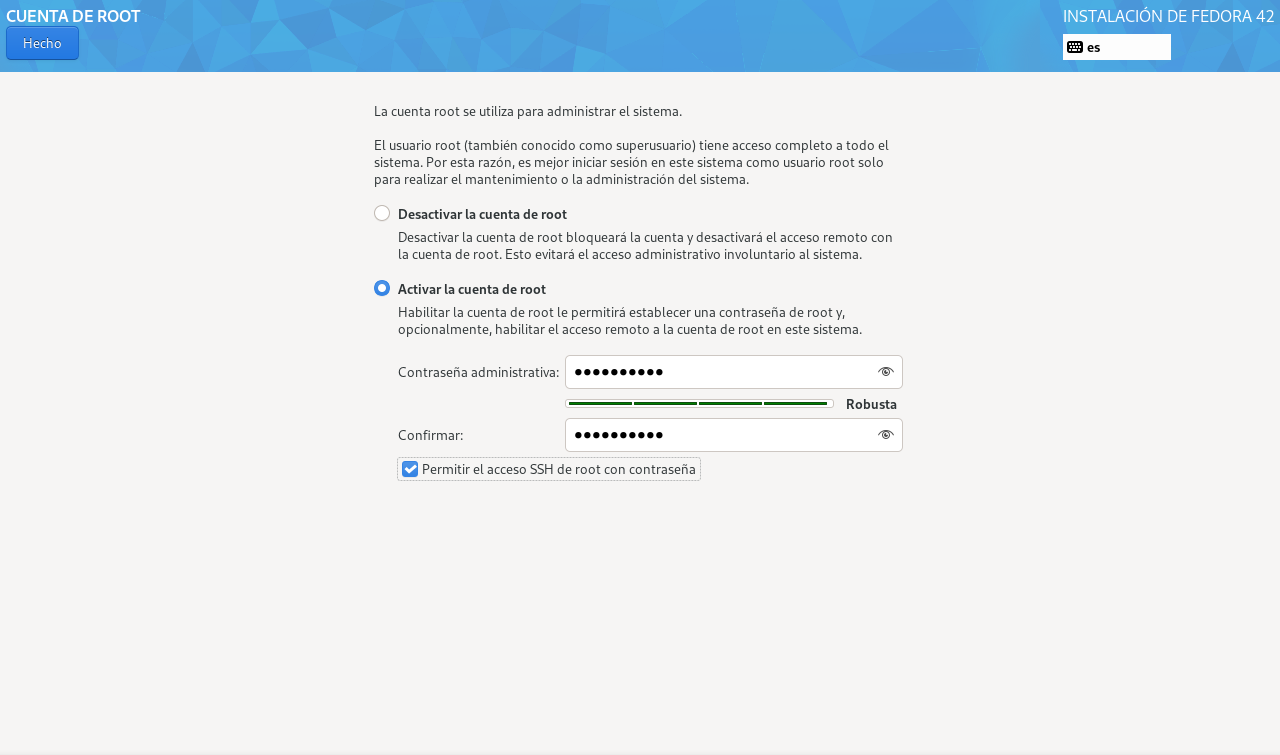 En este apartado podemos seleccionar entre Desactivar la cuenta de root o Activar la cuenta de root. Personalmente, recomiendo la segunda opción. También marcaremos la opción de acceder por SSH con la cuenta de root.
