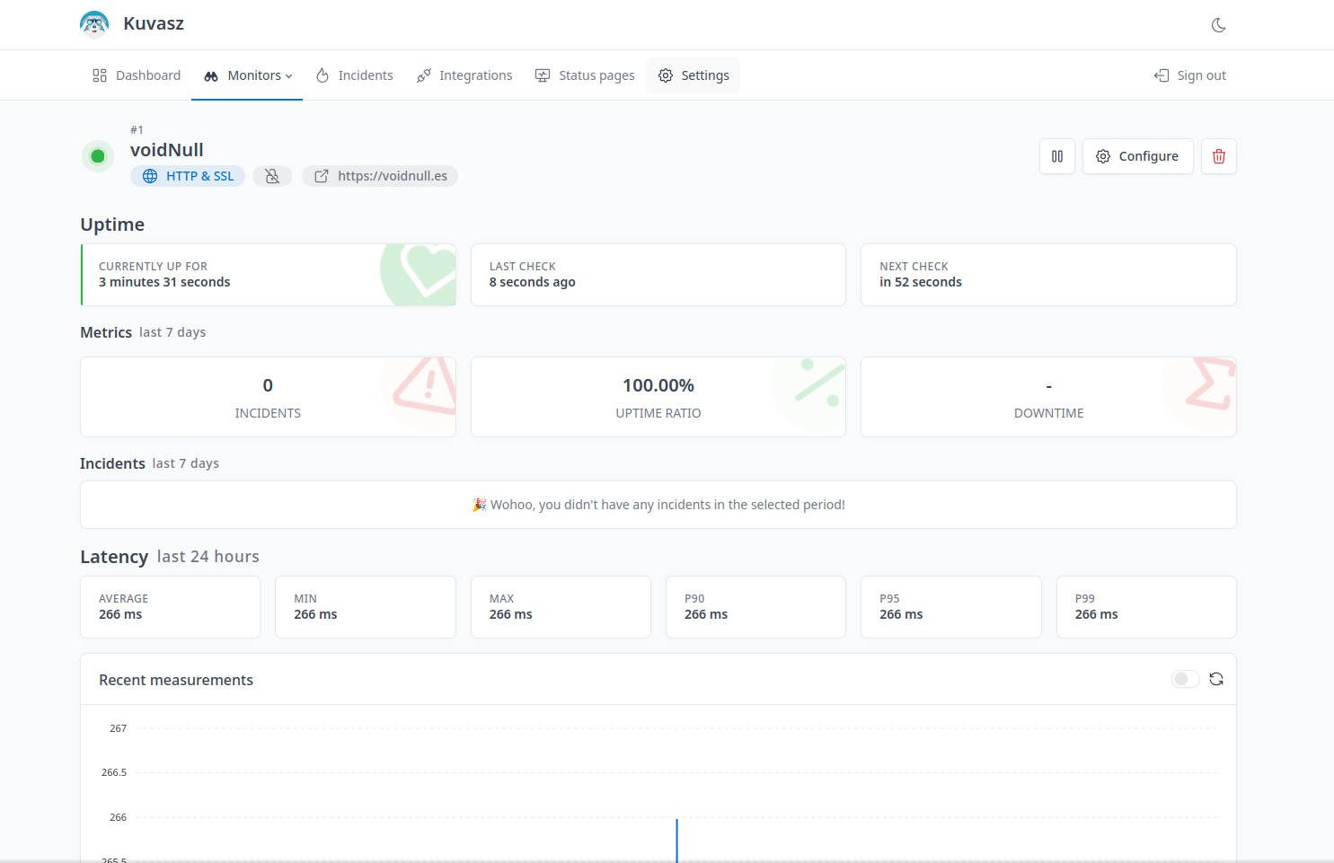 A diferencia de otras soluciones más complejas de monitorización, Kuvasz Uptime apuesta por la simplicidad y la rapidez: en pocos minutos puedes ponerlo en marcha y empezar a recibir estadísticas y alertas. Además, al ser software libre, puedes adaptarlo a tus necesidades y alojarlo en tu propia infraestructura, garantizando el control total sobre tus datos y tu privacidad.