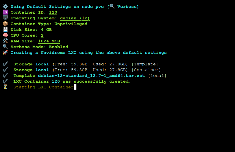 bash -c "$(curl -fsSL https://raw.githubusercontent.com/community-scripts/ProxmoxVE/main/ct/navidrome.sh)"Este script lanzará el asistente de instalación: