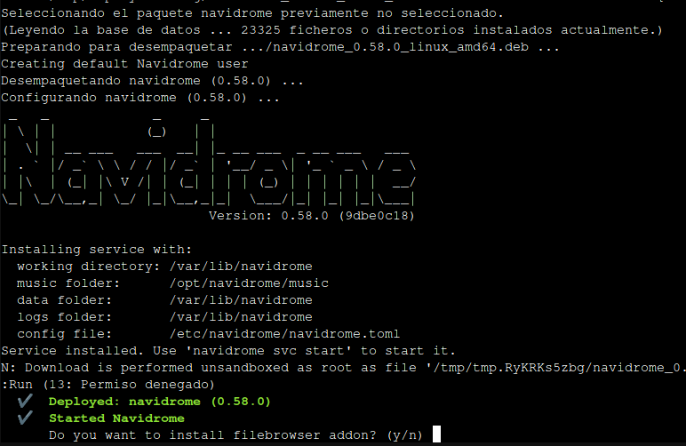 En un momento del proceso, tras instalar la última versión de Navidrome, se nos preguntará si deseamos añadir FileBrowser. Esta herramienta permite gestionar archivos desde el navegador web y facilita subir música a Navidrome de manera sencilla. Su instalación es opcional.