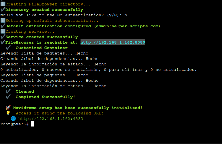 Finalmente, el asistente terminará y nos proporcionará acceso a FileBrowser a través del puerto 8080 y a Navidrome mediante el puerto 4533.
