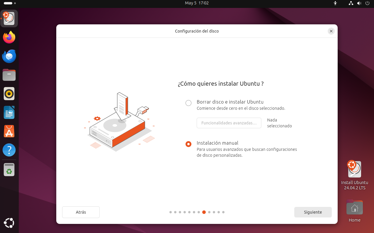 - Instalación manual (particionado personalizado): esta opción te permite definir manualmente las particiones, ideal si deseas tener un mayor control sobre cómo se organiza el sistema, conservar datos existentes o usar un esquema de particionado específico.