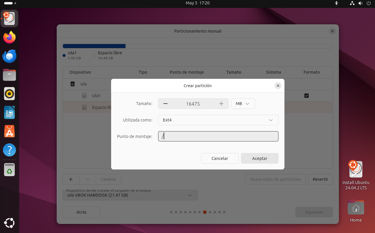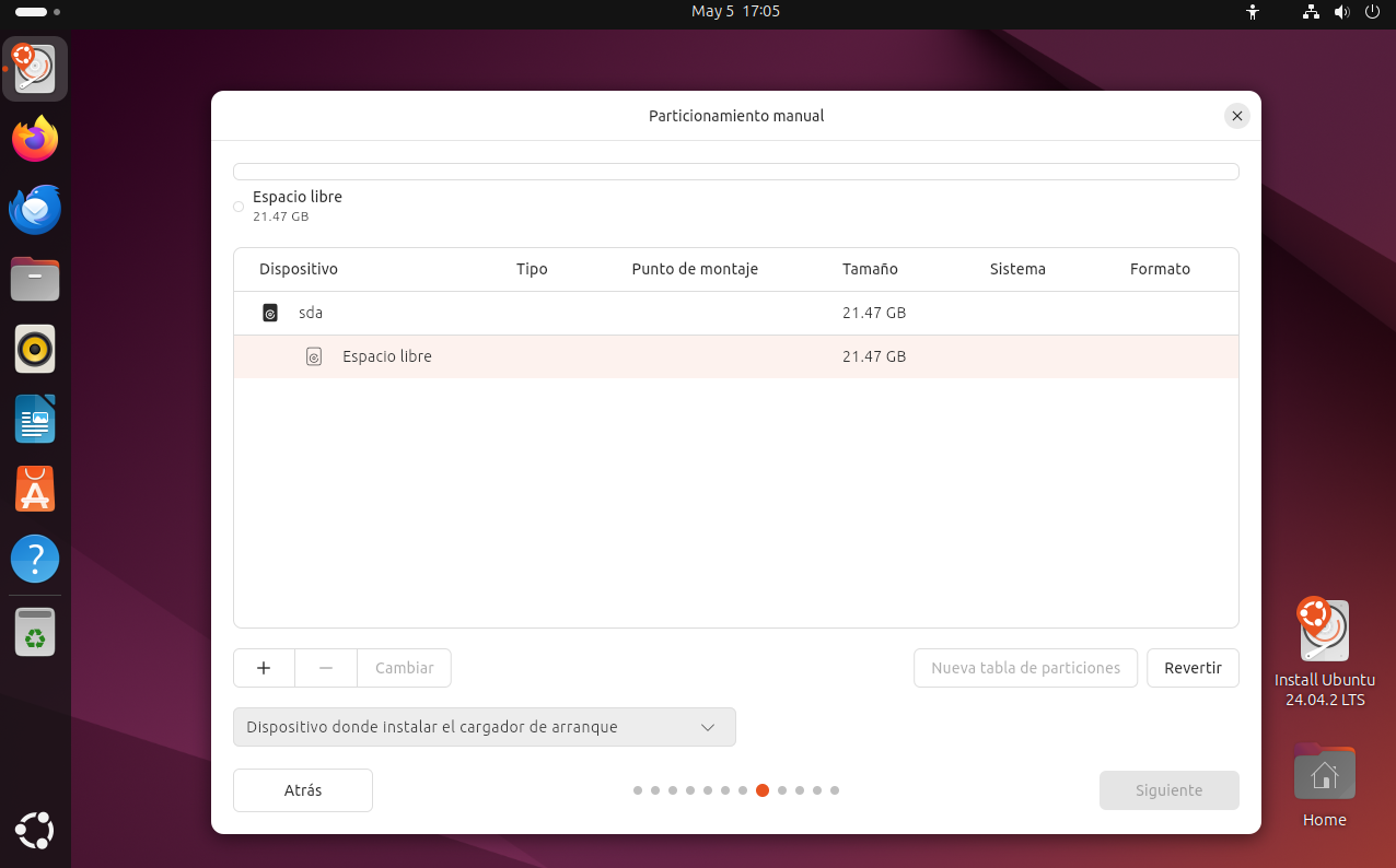 Una vez hayas creado todas las particiones necesarias, en la parte inferior de la ventana verás una opción para seleccionar el dispositivo donde se instalará el cargador de arranque (GRUB). Asegúrate de elegir el mismo disco en el que vas a instalar Ubuntu (por ejemplo, /dev/sda). Esto es fundamental para que el sistema pueda arrancar correctamente una vez completada la instalación.