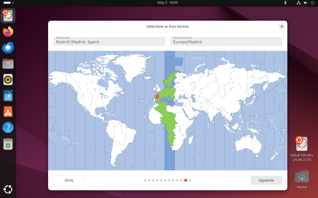 Después, deberás configurar la zona horaria, lo cual es importante para que el reloj del sistema se sincronice correctamente. Para ello, simplemente selecciona tu ubicación en el mapa o escribe el nombre de tu ciudad o país en el campo de búsqueda. El instalador ajustará automáticamente la hora y la fecha en función de la zona seleccionada.