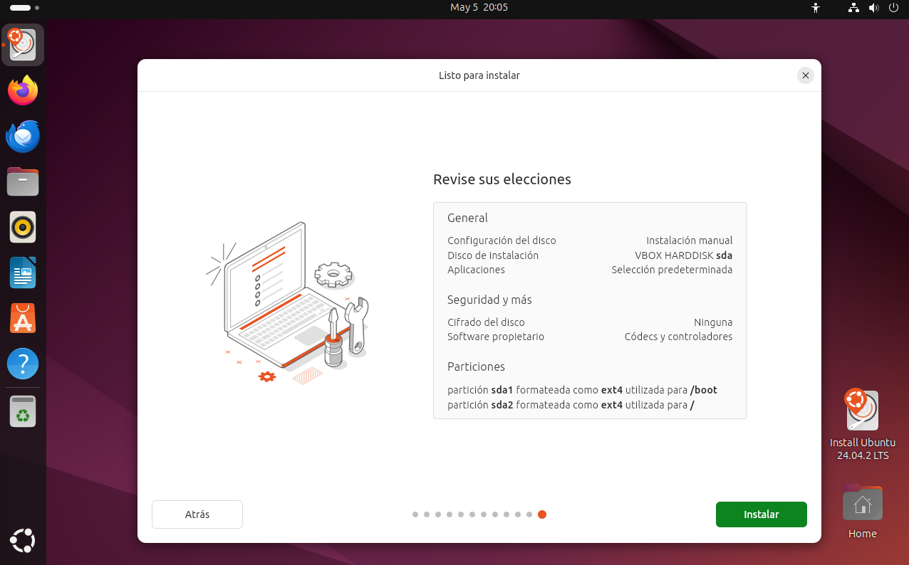 Antes de comenzar la instalación, el sistema te mostrará un resumen con todas las opciones que has configurado: particiones, ubicación, cuenta de usuario, tipo de instalación, etc. Revisa cuidadosamente que todo sea correcto. Si estás seguro de que la configuración es la adecuada, haz clic en el botón “Instalar” para iniciar el proceso.