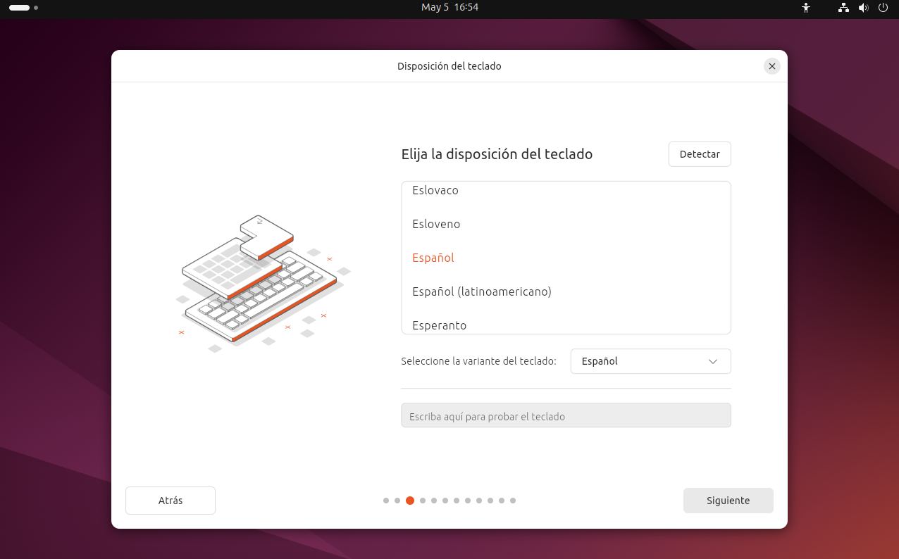 A continuación, deberás seleccionar el tipo de teclado que utilizas. Si estás en España, lo habitual es elegir la opción “Español” (a veces aparece como “Spanish - Spain”). Si tienes dudas, puedes utilizar la herramienta que permite escribir texto de prueba para asegurarte de que las teclas coinciden con lo que aparece en pantalla.