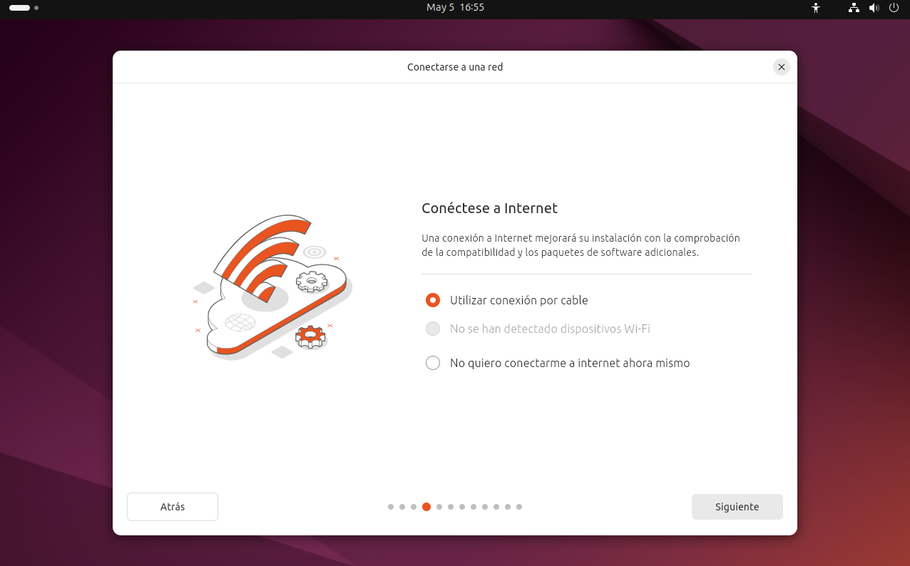Después de seleccionar el idioma, el sistema intentará configurar automáticamente la conexión a internet. Si estás conectado mediante un cable de red (Ethernet), lo más habitual es que se conecte sin que tengas que hacer nada. En caso de que uses Wi-Fi, podrás elegir tu red inalámbrica y escribir la contraseña en la siguiente pantalla. Tener conexión a internet no es obligatorio, pero es recomendable para descargar actualizaciones durante la instalación.