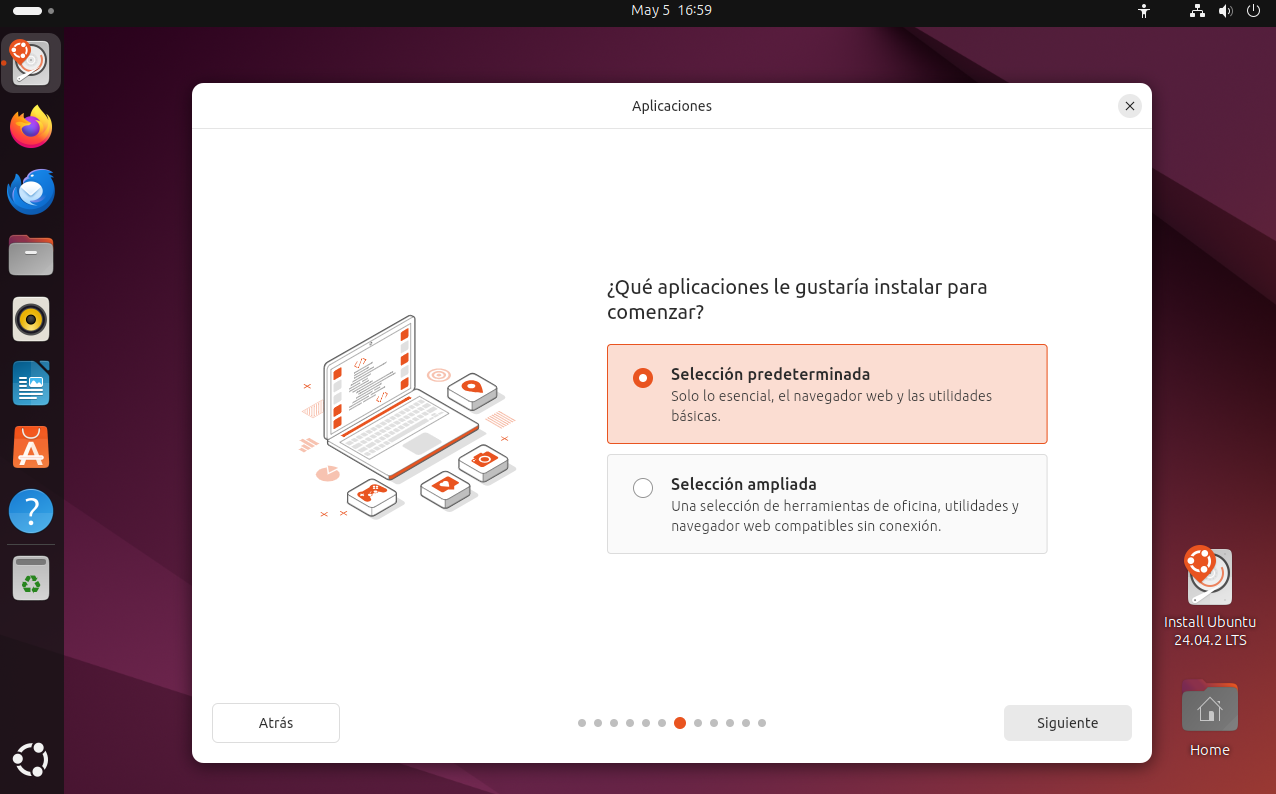 - Selección predeterminada: incluye las aplicaciones básicas necesarias para el uso diario, como navegador web, gestor de archivos, visor de documentos, etc.
