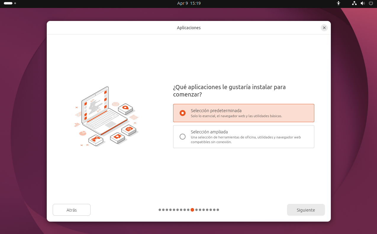 - Selección predeterminada: incluye las aplicaciones básicas necesarias para el uso diario, como navegador web, gestor de archivos, visor de documentos, etc.
