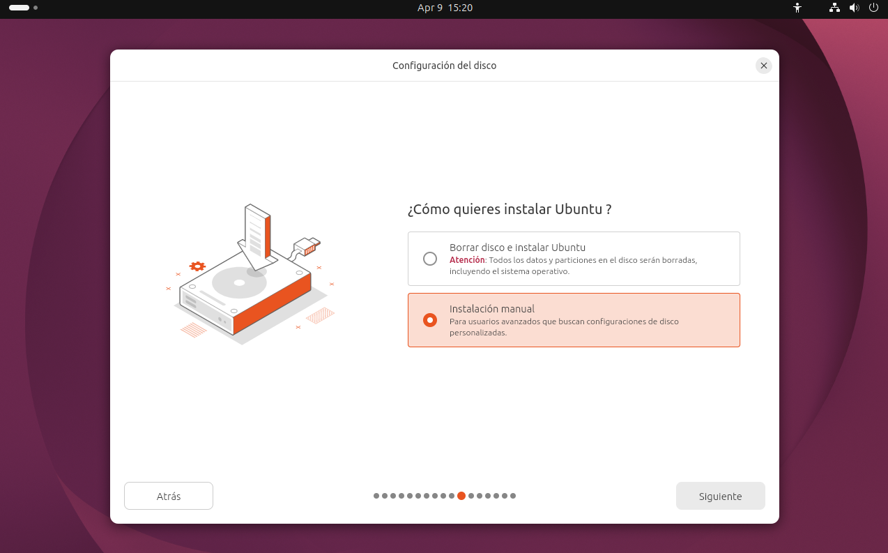 Después, el instalador te ofrecerá dos métodos para instalar Ubuntu en el disco: