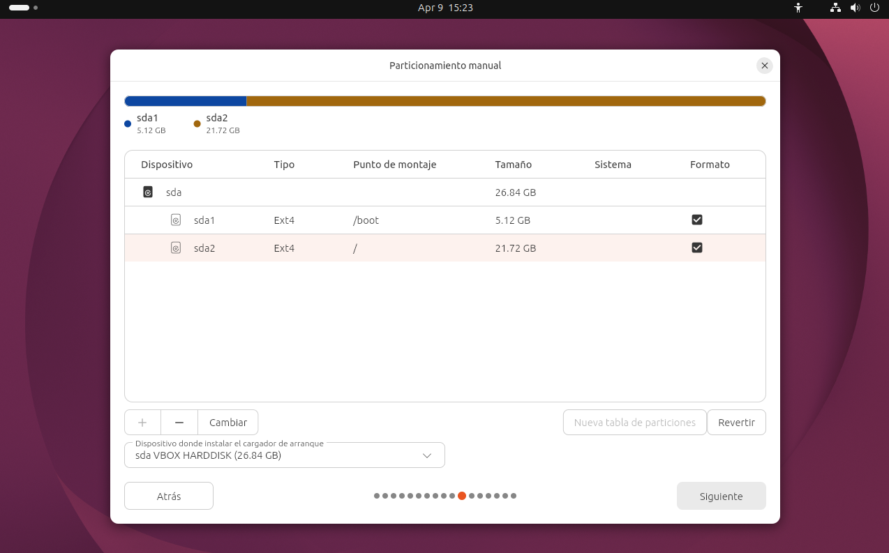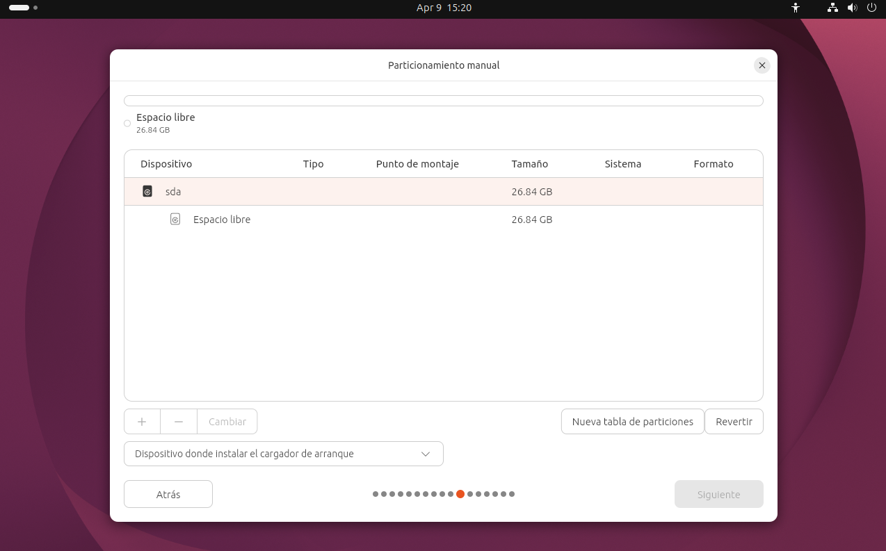 Una vez hayas creado todas las particiones necesarias, en la parte inferior de la ventana verás una opción para seleccionar el dispositivo donde se instalará el cargador de arranque (GRUB). Asegúrate de elegir el mismo disco en el que vas a instalar Ubuntu (por ejemplo, /dev/sda). Esto es fundamental para que el sistema pueda arrancar correctamente una vez completada la instalación.
