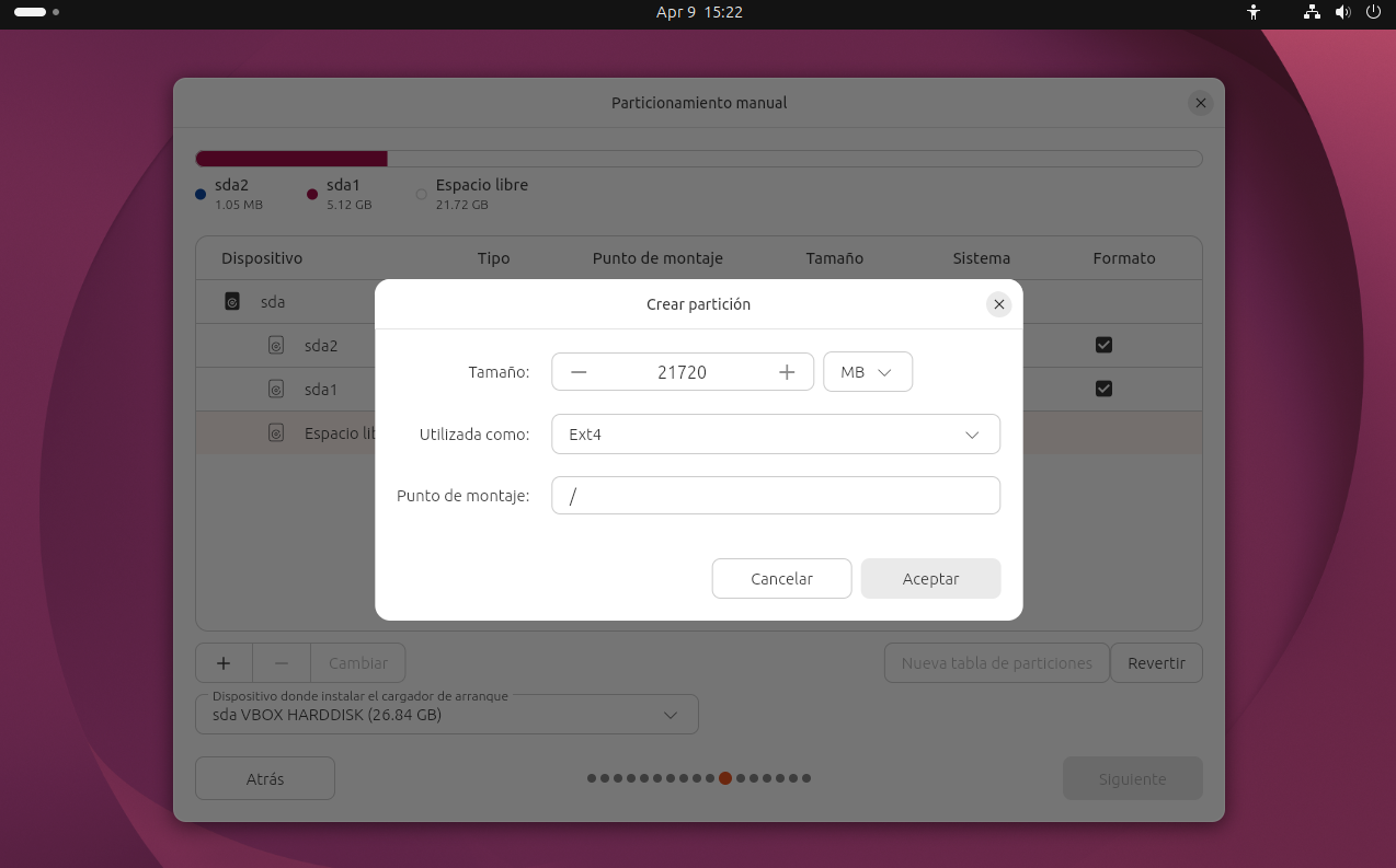 - El punto de montaje, que define para qué se usará la partición dentro del sistema. Por ejemplo, para la partición raíz se debe utilizar