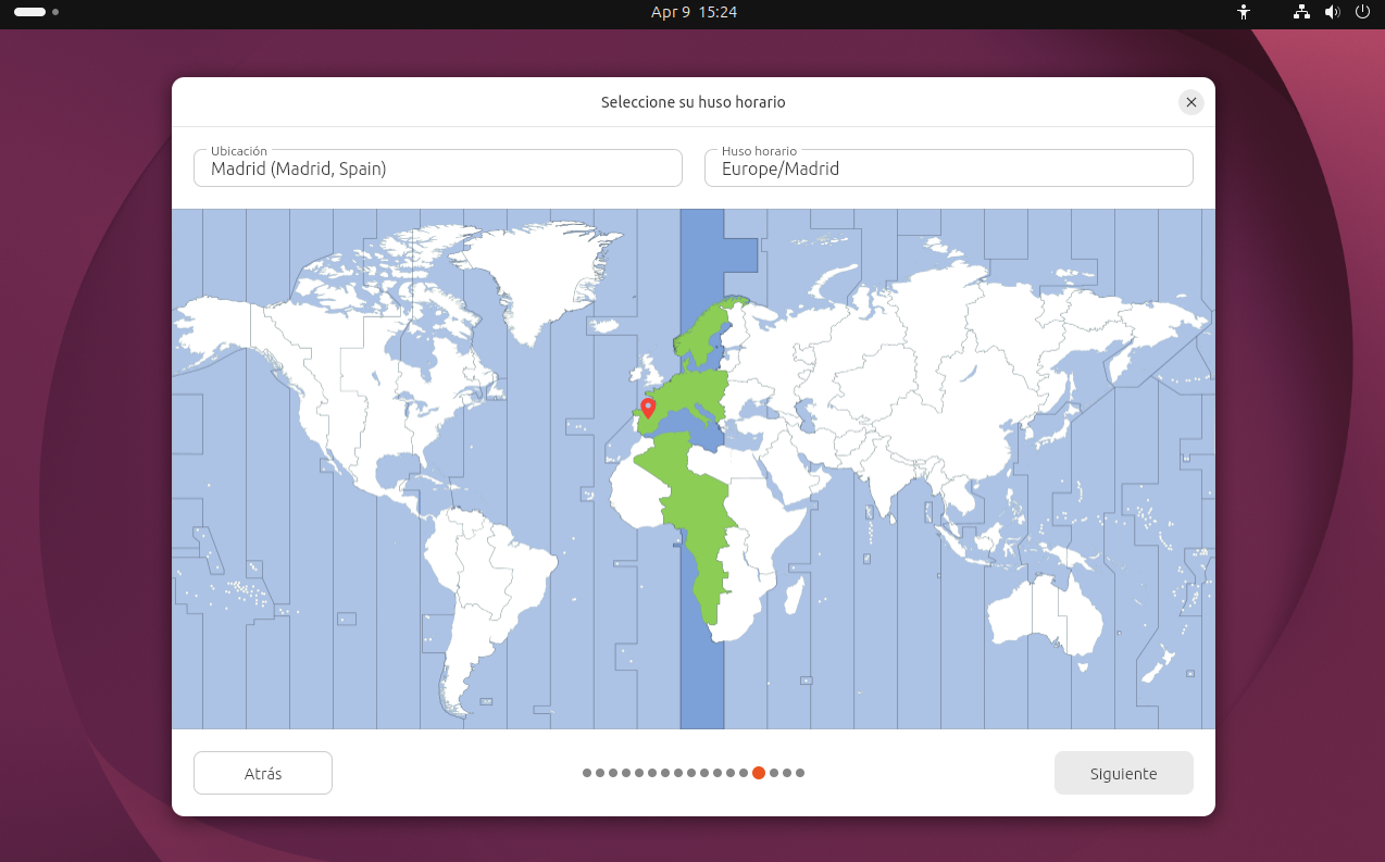Después, deberás configurar la zona horaria, lo cual es importante para que el reloj del sistema se sincronice correctamente. Para ello, simplemente selecciona tu ubicación en el mapa o escribe el nombre de tu ciudad o país en el campo de búsqueda. El instalador ajustará automáticamente la hora y la fecha en función de la zona seleccionada.