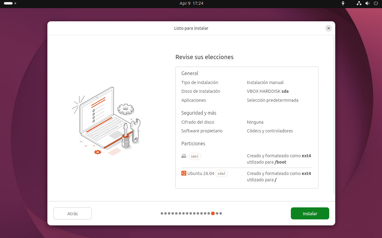 Antes de comenzar la instalación, el sistema te mostrará un resumen con todas las opciones que has configurado: particiones, ubicación, cuenta de usuario, tipo de instalación, etc. Revisa cuidadosamente que todo sea correcto. Si estás seguro de que la configuración es la adecuada, haz clic en el botón "Instalar" para iniciar el proceso.