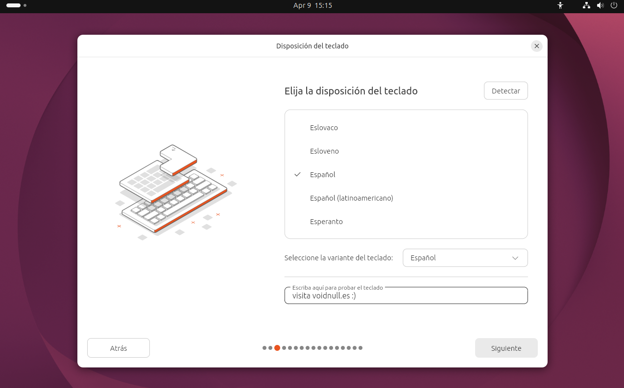 A continuación, deberás seleccionar el tipo de teclado que utilizas. Si estás en España, lo habitual es elegir la opción "Español" (a veces aparece como "Spanish - Spain"). Si tienes dudas, puedes utilizar la herramienta que permite escribir texto de prueba para asegurarte de que las teclas coinciden con lo que aparece en pantalla.