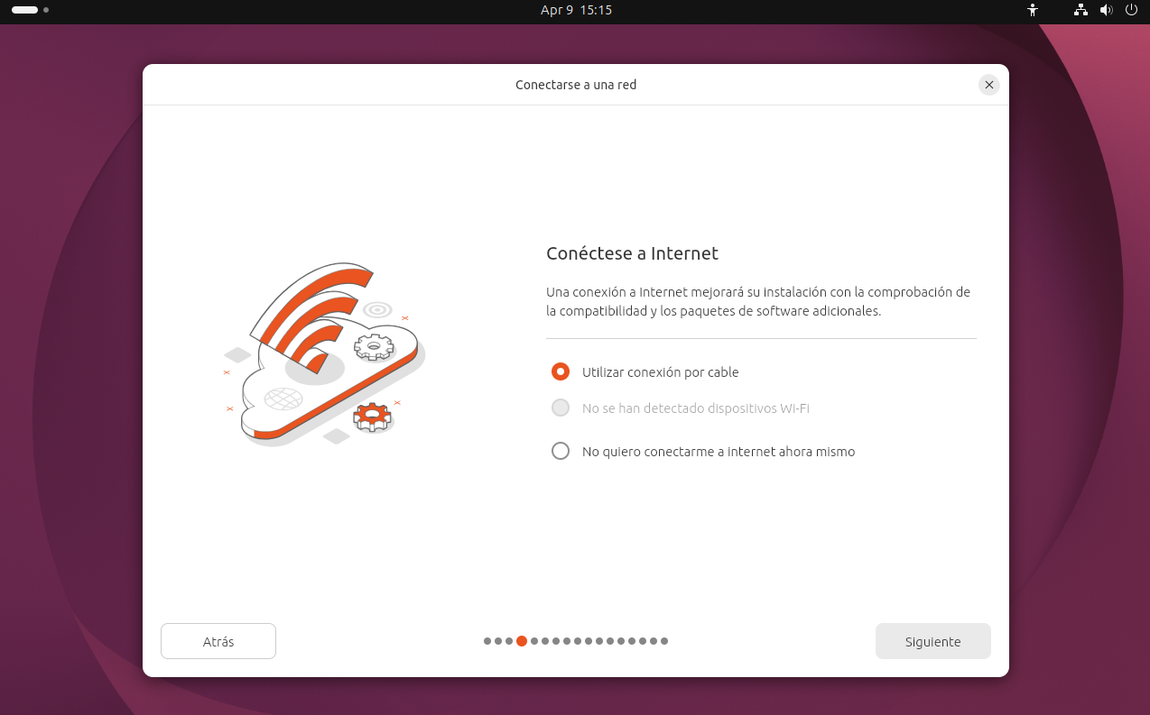 Después de seleccionar el idioma, el sistema intentará configurar automáticamente la conexión a internet. Si estás conectado mediante un cable de red (Ethernet), lo más habitual es que se conecte sin que tengas que hacer nada. En caso de que uses Wi-Fi, podrás elegir tu red inalámbrica y escribir la contraseña en la siguiente pantalla. Tener conexión a internet no es obligatorio, pero es recomendable para descargar actualizaciones durante la instalación.