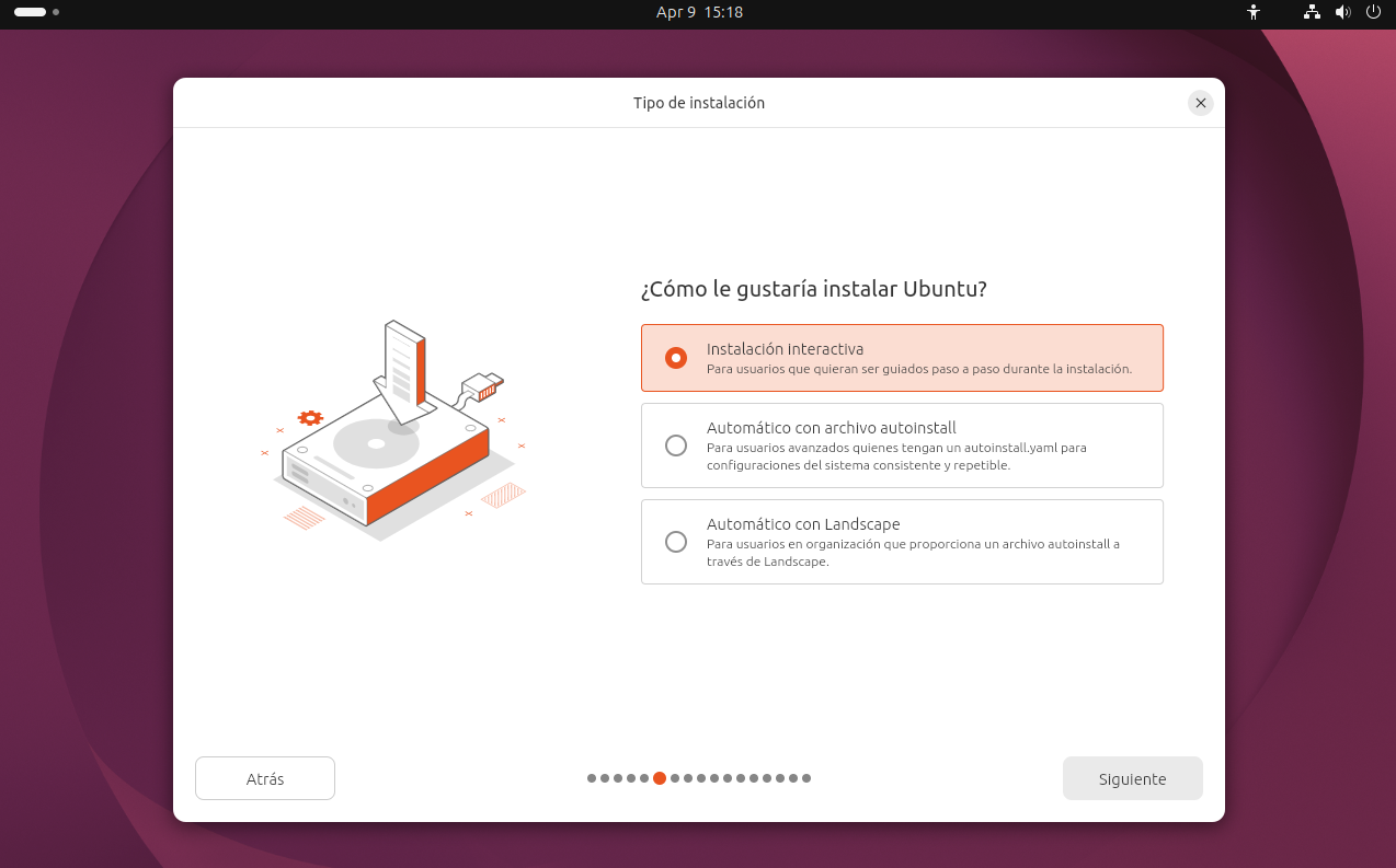 autoinstall.yaml, útil para configuraciones automáticas, repetibles y consistentes, como en entornos empresariales o despliegues masivos. - Automático con Landscape: similar a la anterior pero el fichero autoinstall es a través de Landscape.