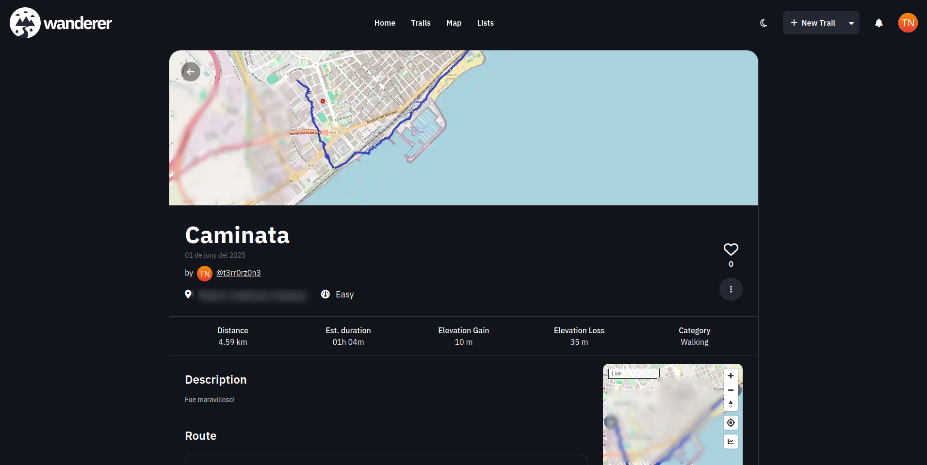 Wanderer es una aplicación reciente y en pleno desarrollo que funciona como una base de datos descentralizada y autogestionada de rutas al aire libre. Diseñada para excursionistas, ciclistas y amantes de la aventura, permite crear, importar y compartir rutas GPS, todo manteniendo el control total sobre tus datos.