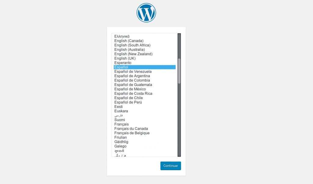 Una vez hemos accedido a nuestro dominio, podremos iniciar la instalación, primero, escogeremos el idioma de la instalación y del WordPress: