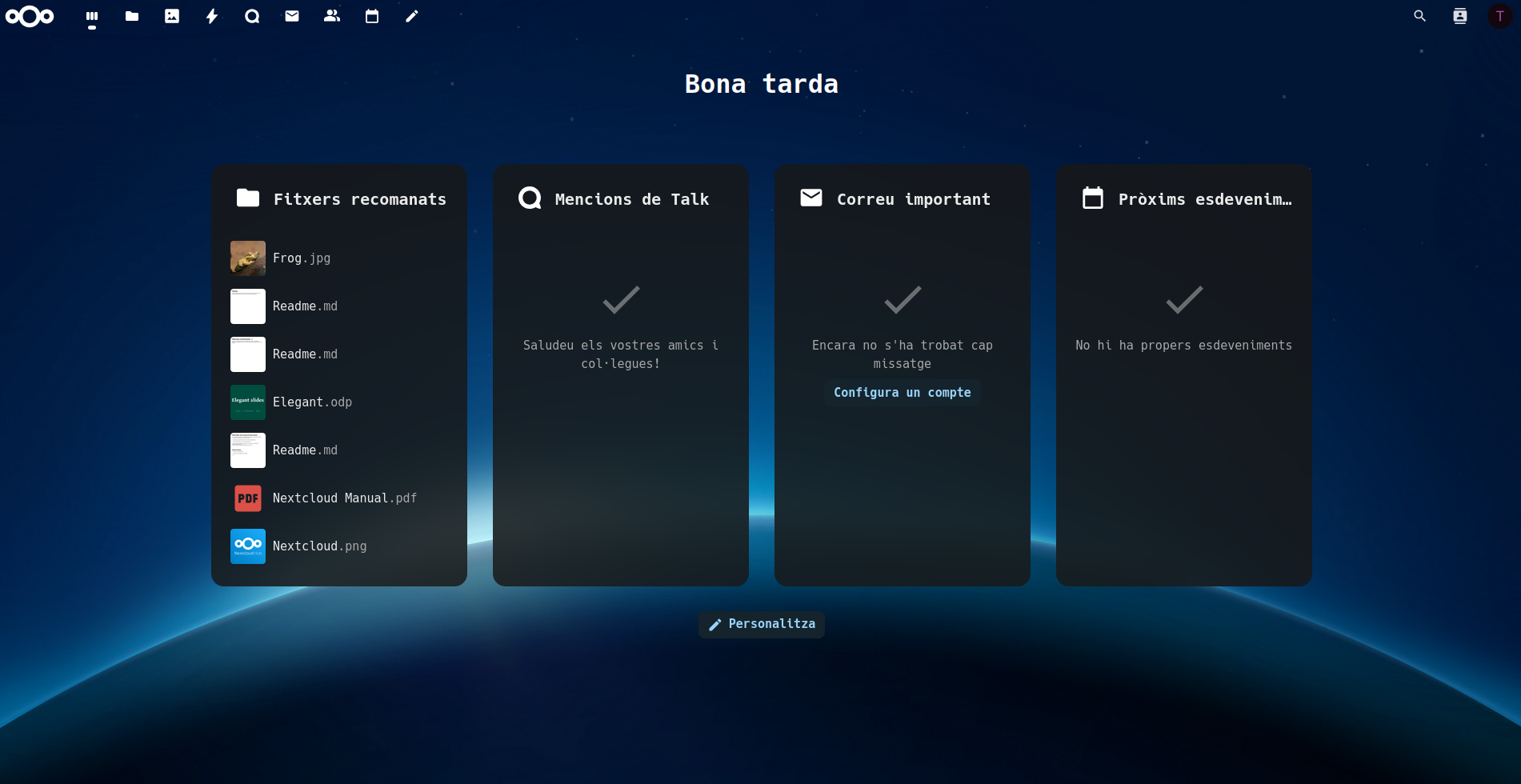 Y con todo esto tendríamos nuestra nube personal en nuestro servidor. Desde hace varios años que estoy usando NextCloud y podría decir que es de lo mejor que tenemos en el mundo del Software Libre. Lo utilizo para todo, para tener mis ficheros -antes lo usaba mucho para clase-, también tengo mis calendarios, mis contactos -con los que podéis sincronizar en Android con DavDroid- también tengo mi nube federada con otras nubes de amigos. Es una locura todo lo que se puede hacer, yo recomiendo investigar.