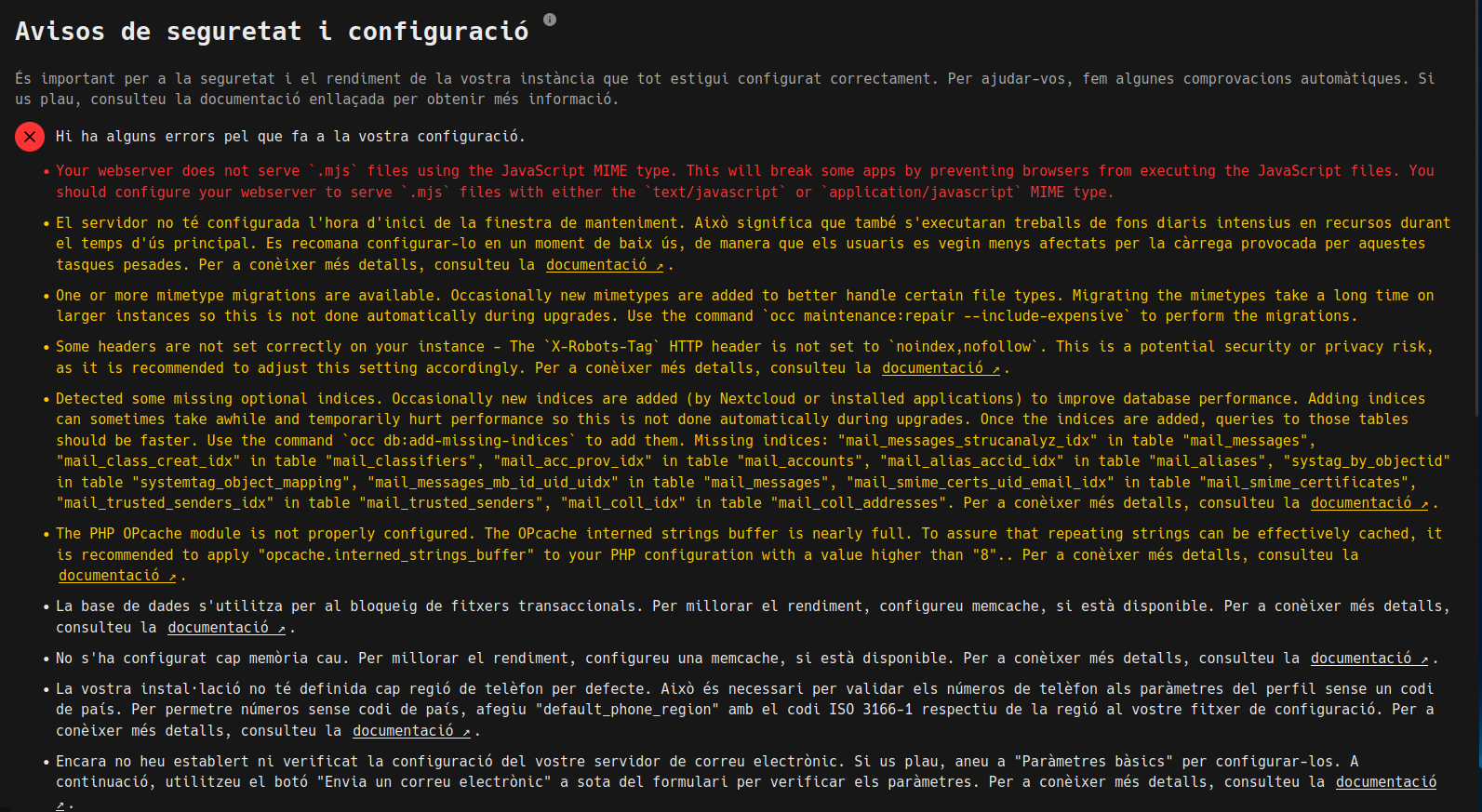 Ahora mismo ya tenemos un NextCloud funcional y que se puede utilizar, pero hay una configuración muy recomendable e interesante para hacer a NextCloud y eso mismo vamos a explicar. Para empezar, si vamos a Configuración > Ajustes Básicos veremos que nos aparecen varios errores que podemos corregir con esta configuración: